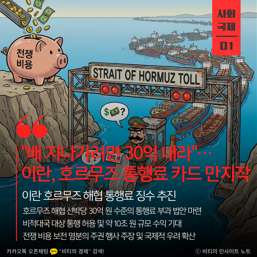 이란이 호르무즈 해협을 지나는 선박에 척당 약 30억 원의 통행료를 부과하는 방안을 검토 중입니다. 전쟁 비용 보전과 안보 유지를 명분으로 내세웠으며, 비적대적 국가의 선박에만 통행을 허용하며 막대한 수익을 챙기겠다는 구상입니다.