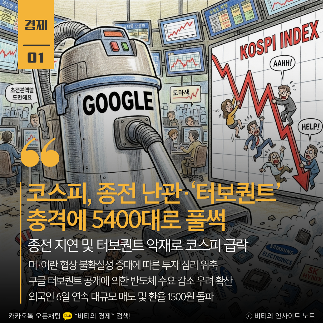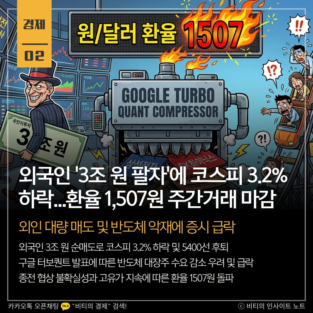 외국인의 3조 원대 대규모 매도세로 코스피가 3.2% 급락하며 5400선으로 후퇴했습니다. 구글의 새로운 메모리 기술 발표와 중동 종전 협상의 불확실성이 겹치며 환율까지 1500원을 돌파하는 등 금융시장의 불안감이 고조되었습니다.