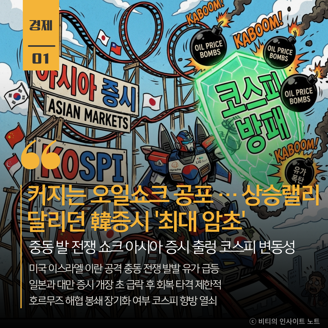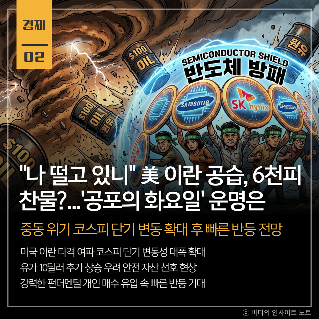 사상 최고치를 질주하던 코스피가 중동의 거대한 모래폭풍을 만나 단기적인 숨 고르기에 들어간 형국 10달러 이상 치솟을 수 있는 국제 유가와 인플레이션 우려는 분명한 악재지만 위기 뒤에 항상 기회가 있었음을 기억해야 할 때 막강한 개인 투자자들의 자금력과 반도체 산업의 탄탄한 펀더멘털이 든든한 방어막 역할을 해줄 것으로 기대되며 섣부른 공포에 휩쓸리기보다는 차분하게 시장의 흐름을 주시하며 옥석 가리기에 집중해야 함