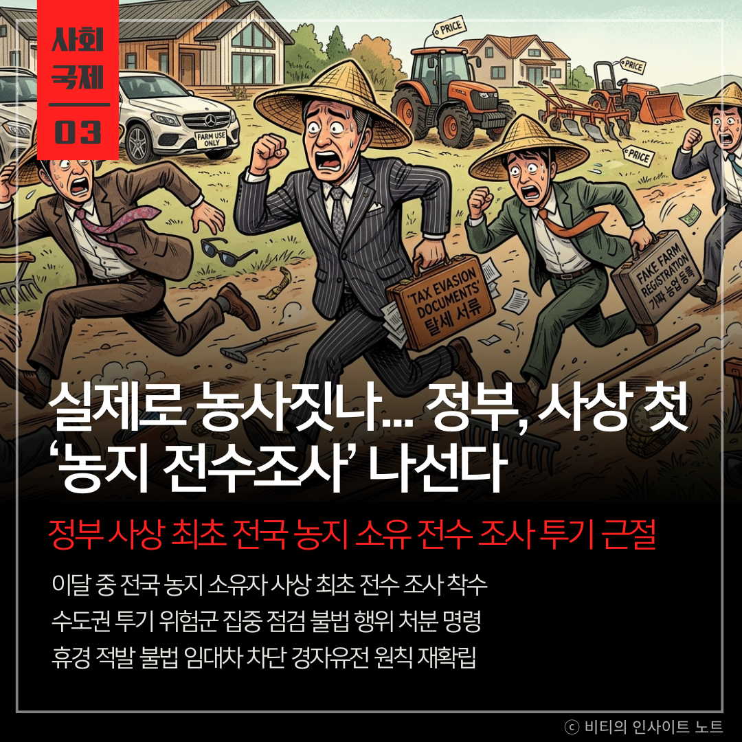 정부가 이르면 이달 중 전국 농지 소유자를 대상으로 사상 첫 전수 조사를 전격 실시하기로 결정하며 수도권 중심의 투기 위험군을 강도 높게 들여다볼 계획 헌법상 경자유전 원칙을 확립하고 농지가 부동산 투기 대상으로 전락하는 것을 원천 차단하기 위한 이재명 대통령의 지시에 따른 강력한 조치