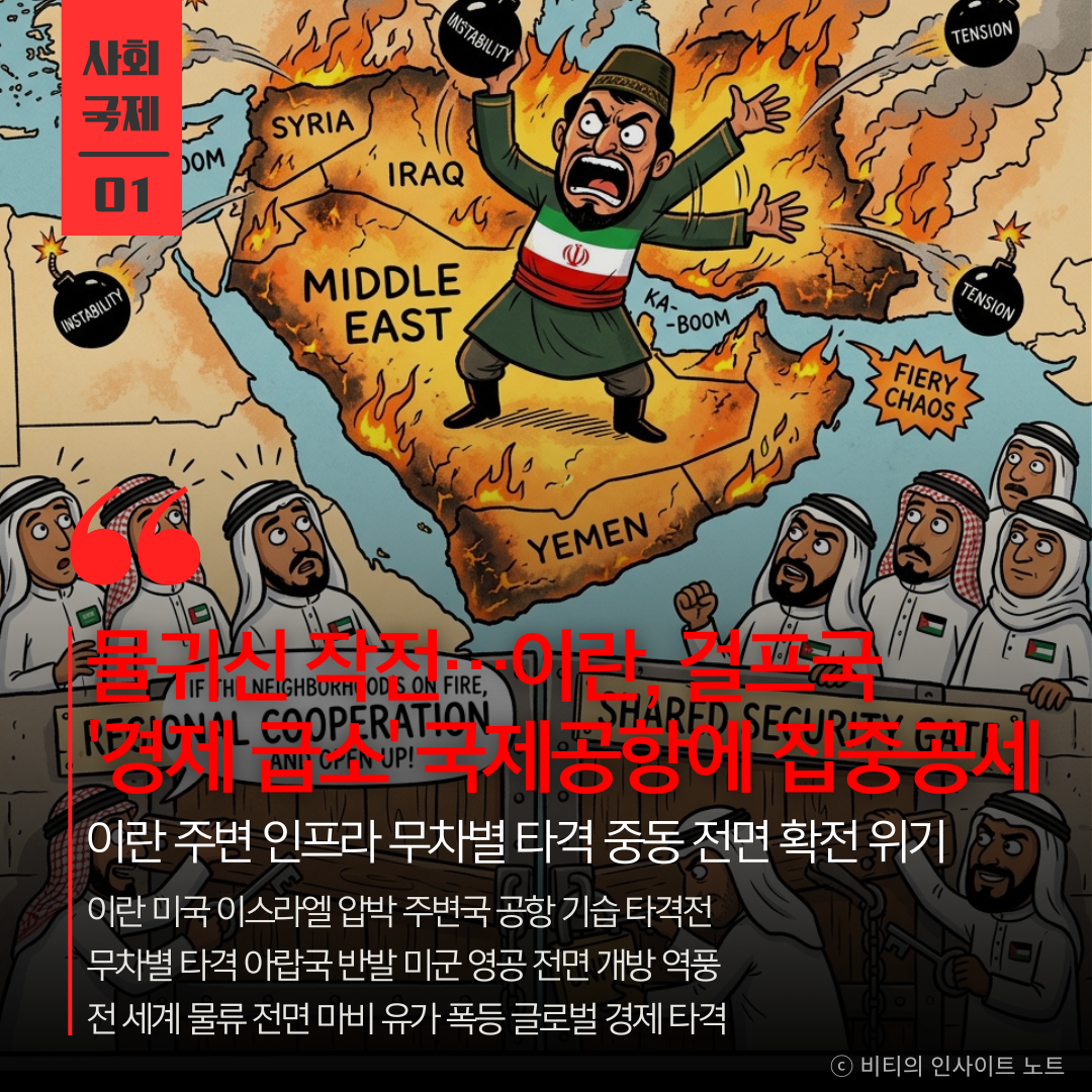 이란의 주변 걸프국 무차별 타격으로 글로벌 물류 마비와 유가 폭등 등 중동발 경제 위기 및 전면 확전 우려 고조
