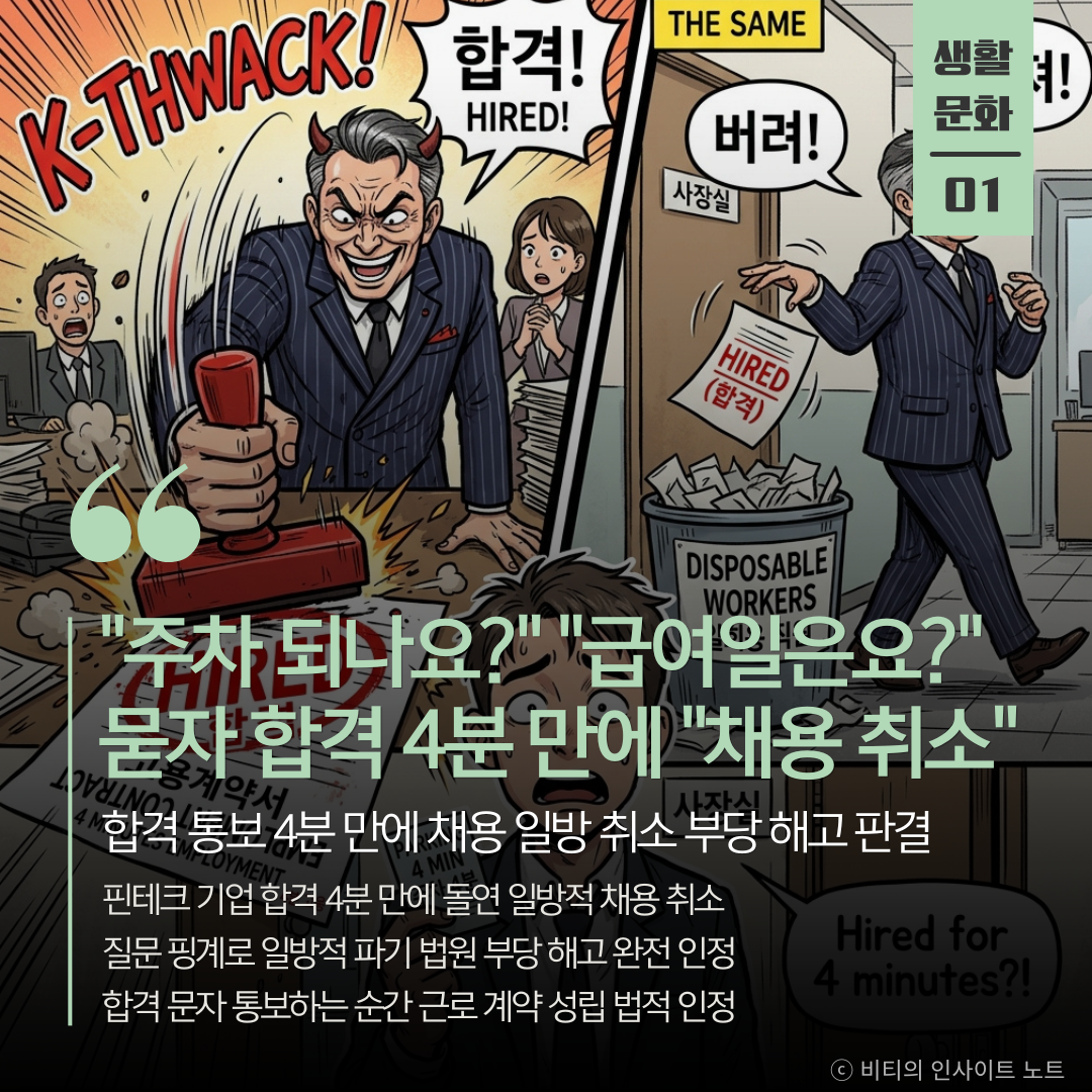 서울행정법원은 합격 문자를 보낸 지 불과 4분 만에 돌연 채용 취소를 통보한 핀테크 업체 대표의 행위가 명백한 부당 해고에 해당한다고 판결함 지원자가 주차 가능 여부와 급여일을 묻자 대표는 곧바로 채용을 취소하겠다는 메시지를 보냈고 이에 지원자는 노동위원회에 구제 신청을 제기해 승소함