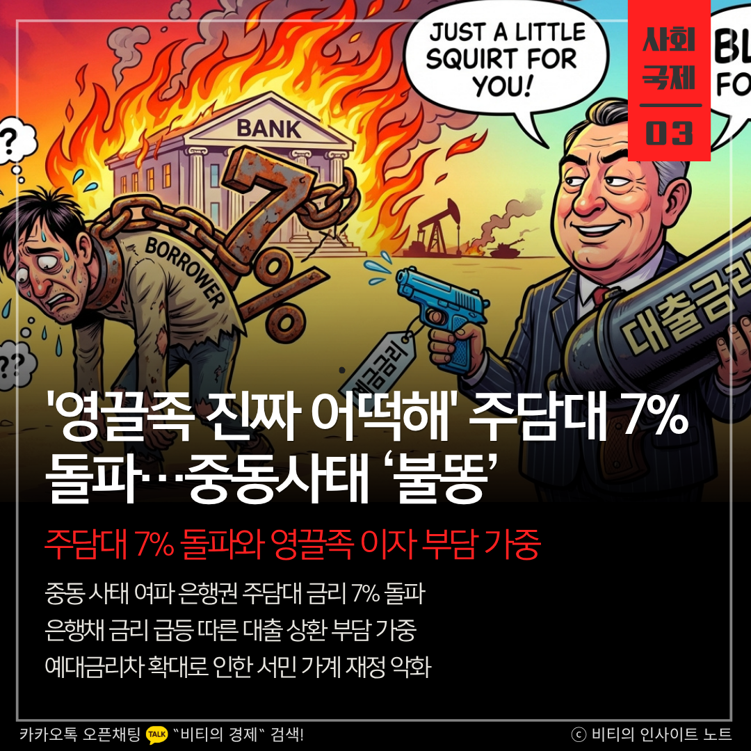 금리 인하 기대가 중동발 악재에 가로막힌 형국입니다. 은행채 상승분이 대출자에게는 즉각 전이되는 반면 예금자에게는 더디게 반영되는 비대칭적 구조가 영끌족의 고통을 배가시키고 있습니다. 단순한 지표 변동을 넘어 가계 부채의 질적 악화를 막기 위한 선제적인 금융 안전망 점검이 매우 시급한 시점입니다.