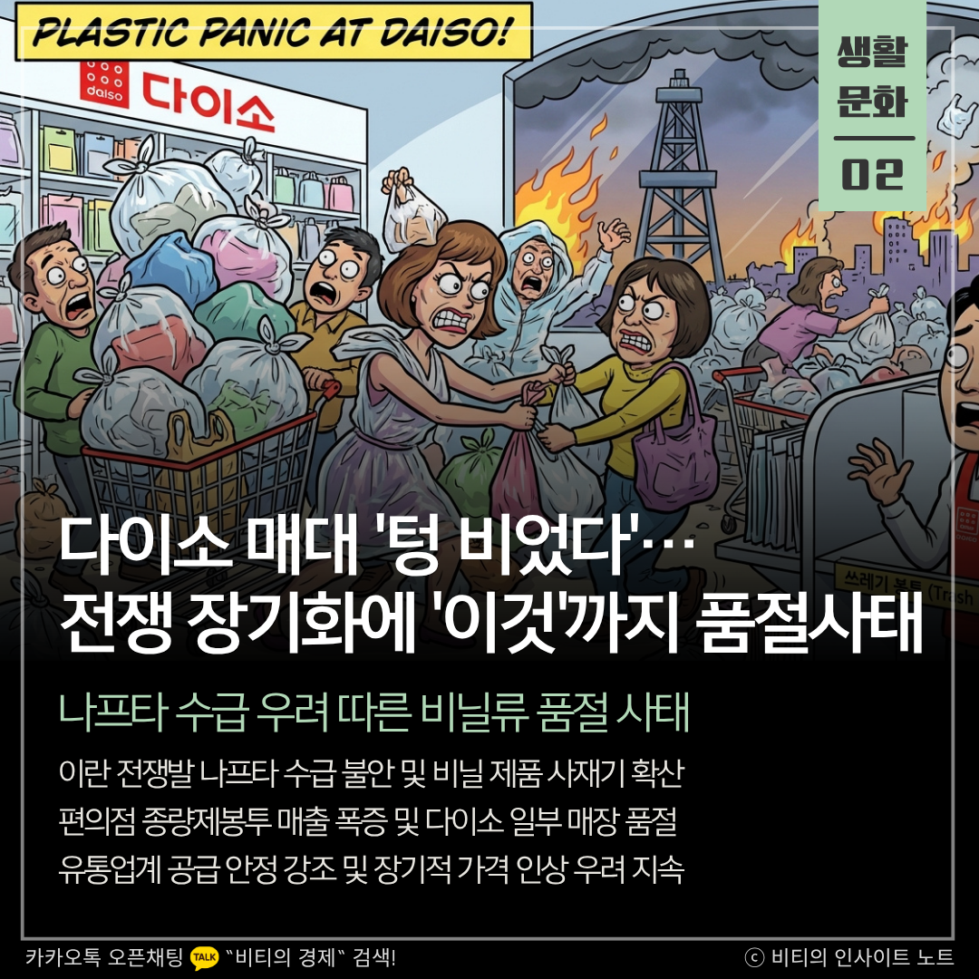 미국과 이란의 전쟁 장기화로 원유 공급 불안이 커지면서 비닐 제품의 원료인 나프타 수급 차질 우려가 확산되고 있습니다. 이로 인해 다이소와 편의점에서 위생백과 종량제봉투를 대량 구매하는 사례가 늘어나며 일부 매장에서 일시적인 품절 사태가 빚어지고 있습니다.