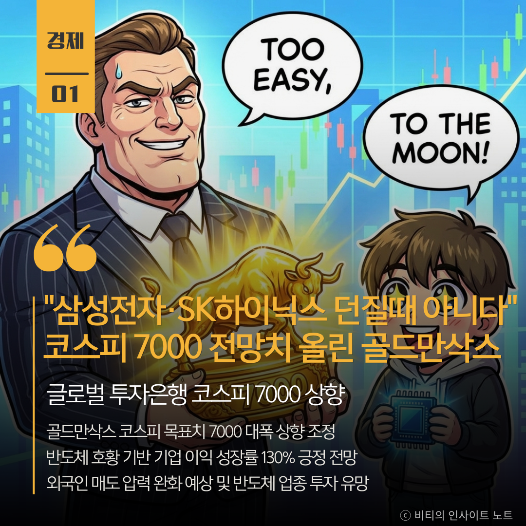 골드만삭스를 비롯한 주요 글로벌 투자은행들이 국내 증시의 단기 조정 이후 코스피가 새로운 고점을 기록할 것으로 전망하며 목표치를 7000으로 대폭 상향했습니다. 반도체 기업의 실적 성장과 높은 밸류에이션 매력이 주요 근거입니다.
