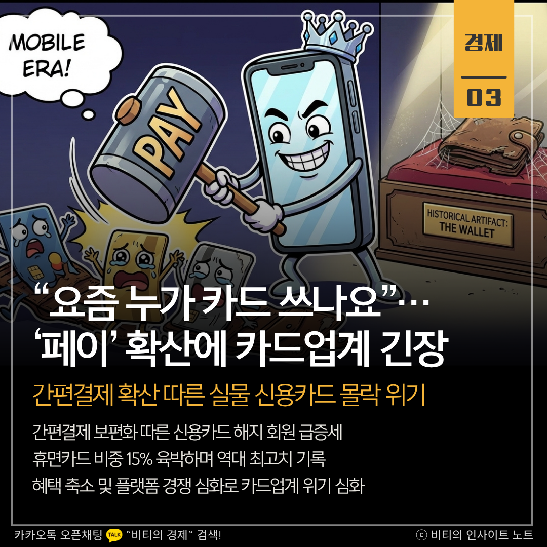삼성페이와 카카오페이 등 간편결제의 급격한 확산으로 실물 신용카드의 입지가 좁아지며 카드업계에 비상이 걸렸습니다. 신규 회원은 정체된 가운데 해지 회원은 급증하고 있으며, 발급 후 쓰지 않는 휴면카드 비중도 역대 최고치를 기록하는 등 결제 패러다임이 변하고 있습니다.