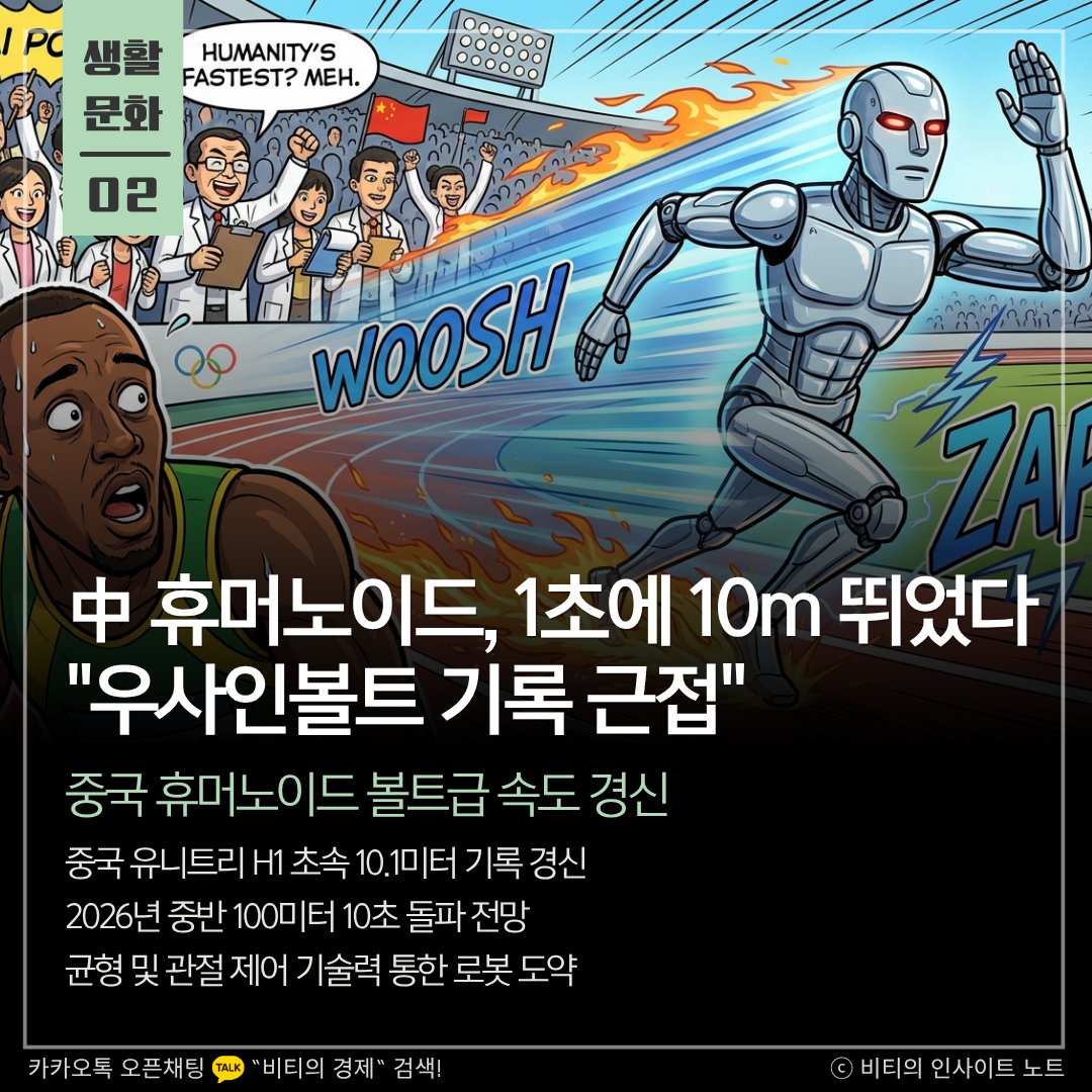 중국 로봇 스타트업 유니트리의 휴머노이드 H1이 초속 10.1미터를 기록하며 우사인 볼트의 기록에 근접했습니다. 이는 로봇의 균형 제어와 동력 효율 기술력을 입증한 사례로, 2026년 중반에는 인간의 한계를 넘어설 것이라는 야심 찬 전망까지 나오고 있습니다.