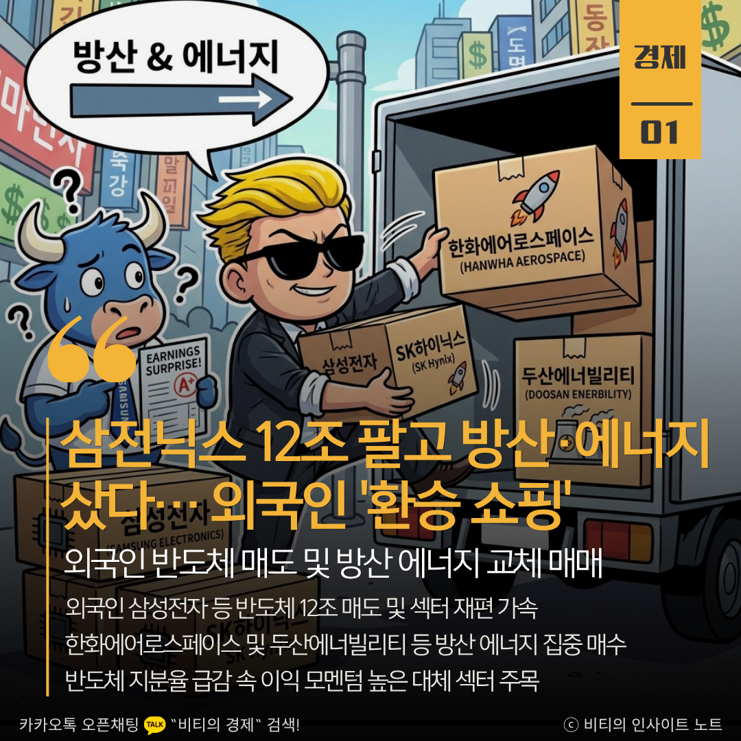 외국인 투자자들이 삼성전자와 SK하이닉스 등 반도체주를 대거 매도하고 그 자금으로 방산과 에너지 종목을 사들이는 섹터 재편에 나섰습니다. 이는 한국 시장 이탈이 아닌 미래 성장성이 높은 업종으로의 포트폴리오 조정으로 풀이되며 향후 수급 변화에 주목할 필요가 있습니다.