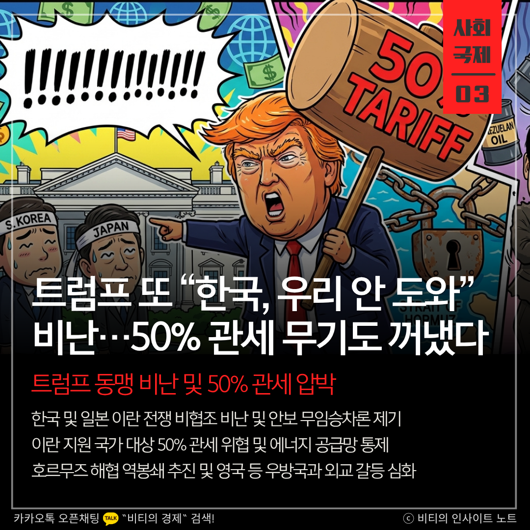 트럼프 대통령이 이란 전쟁 비협조를 이유로 한국과 일본 등 동맹국을 강력히 비난했습니다. 이란 지원 국가에 50% 관세 부과를 예고하고 호르무즈 해협 역봉쇄 카드를 꺼내며 에너지 수급과 동맹 관계를 무기로 전방위적인 압박 수위를 높이고 있습니다.