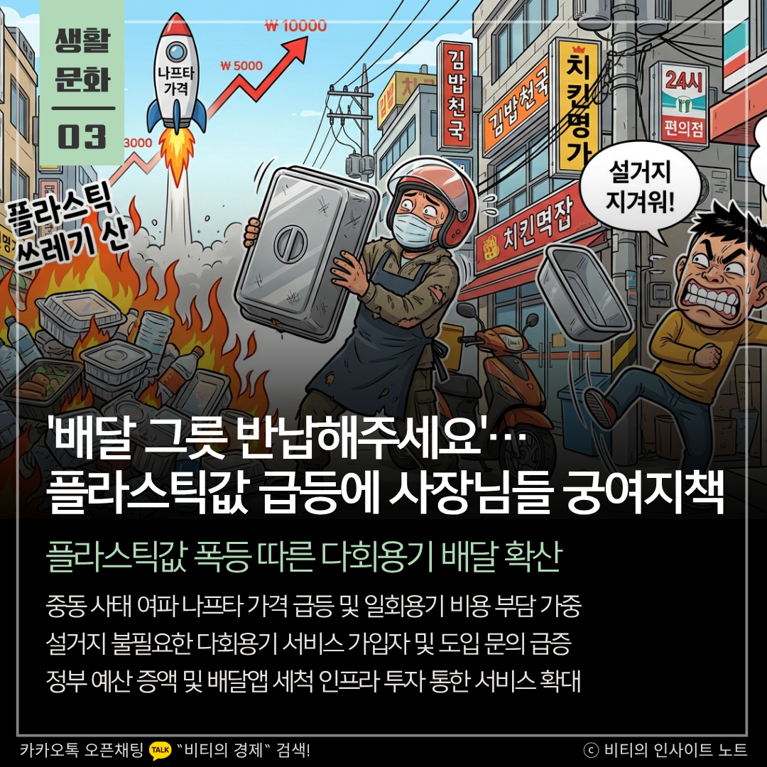 중동 전쟁 여파로 플라스틱 원가가 급등하면서 배달 시장에 다회용기 바람이 불고 있습니다. 비용 부담을 느낀 자영업자와 쓰레기를 줄이려는 소비자들의 니즈가 맞물려 관련 서비스 가입자가 급증하고 있으며 배달 플랫폼들도 인프라 투자를 확대하는 추세입니다.