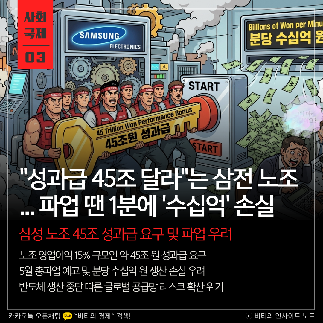 삼성전자 노조가 영업이익의 15%에 달하는 약 45조 원의 성과급을 요구하며 5월 총파업을 예고했습니다. 반도체 생산 라인이 멈출 경우 분당 수십억 원의 손실이 예상되어 글로벌 공급망 차질에 대한 우려가 커지고 있습니다.