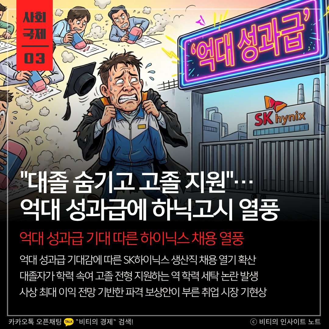 SK하이닉스 생산직 채용에 억대 성과급 기대감이 더해지며 지원 열기가 뜨겁습니다. 특히 고졸 전형에 대졸자가 학력을 속여 지원하려는 역 학력 세탁 논란까지 빚어지며 이른바 하닉고시 열풍이 취업 시장의 최대 화두로 떠오르고 있습니다.