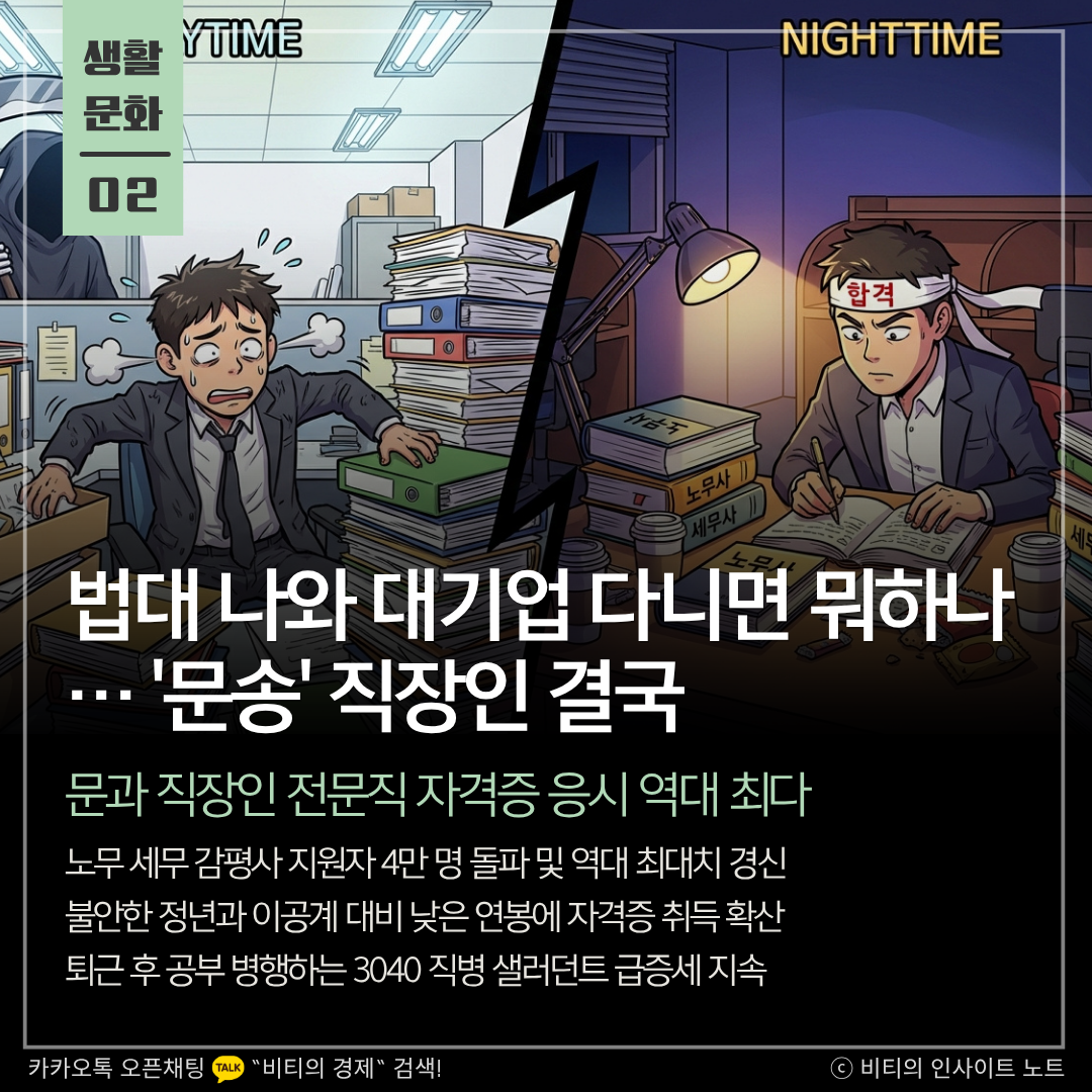 지난해 노무사 세무사 감정평가사 지원자가 4만 명을 돌파하며 역대 최대를 기록했습니다. 정년 불안과 이공계와의 임금 격차를 느끼는 문과 출신 3040 직장인들이 평생 자격증 취득을 위해 퇴근 후 학원가로 몰리며 생존을 위한 사투를 벌이고 있습니다.