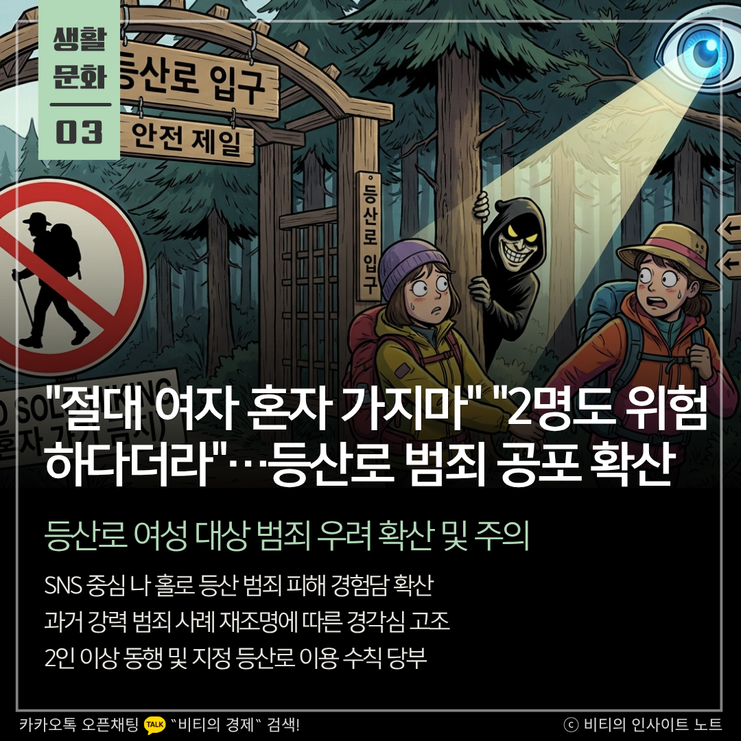 최근 SNS를 중심으로 여성 홀로 등산 시 범죄 노출 위험에 대한 경험담이 확산하며 경각심이 높아지고 있습니다. 뒷산이나 도심 인근 산에서도 추격 사건 등이 공유되고 있어, 지정 등산로 이용과 2인 이상 동행 등 산행 안전 수칙 준수가 강력히 권고되는 시점입니다.