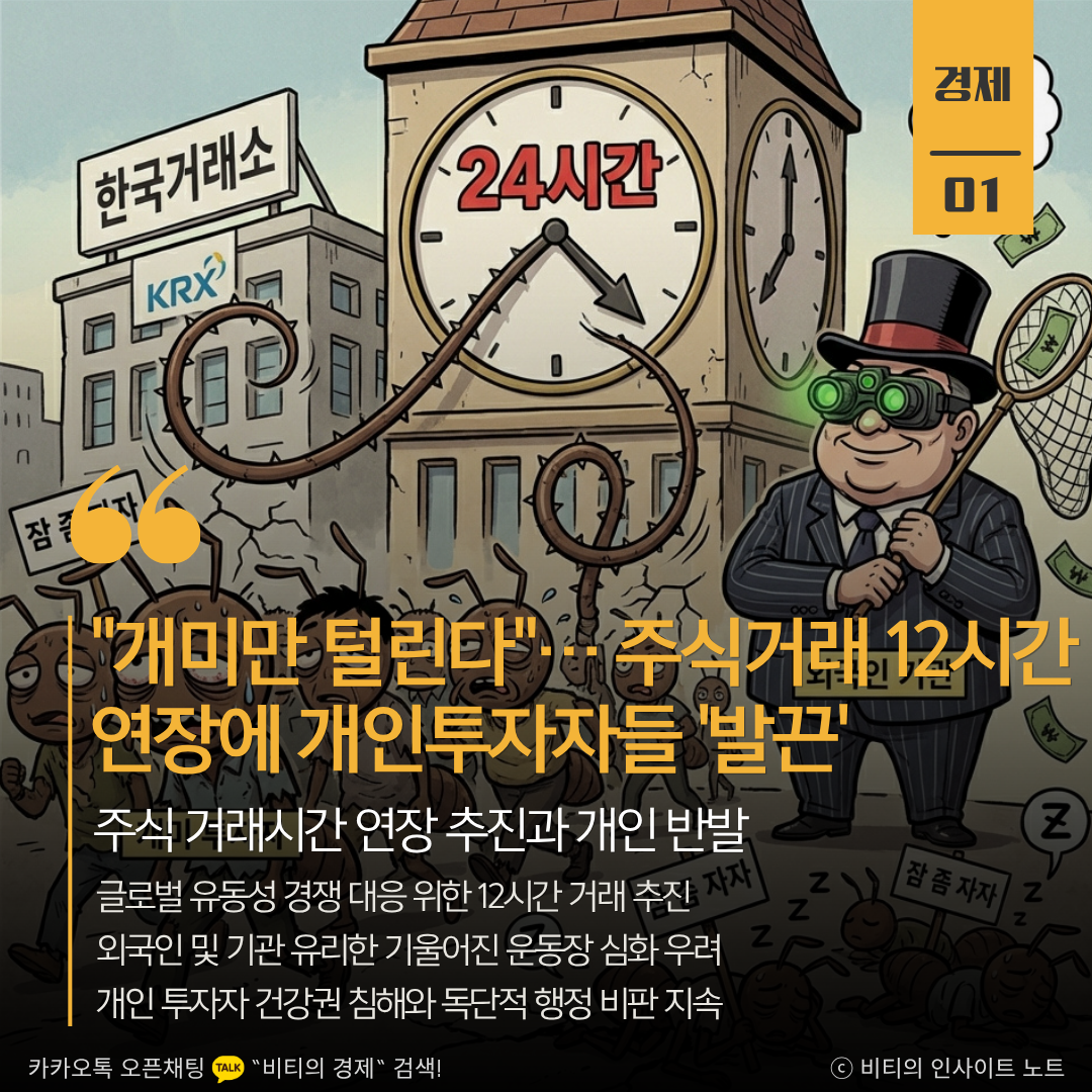 한국거래소가 미국 등 글로벌 거래소의 유동성 흡수에 대응하기 위해 주식 거래 시간 12시간 연장을 추진하고 있습니다. 이에 대해 개인투자자들은 정보력과 자금력이 우세한 외국인에게만 유리한 기울어진 운동장이 심화될 것이라며 강력히 반발하고 나섰습니다.