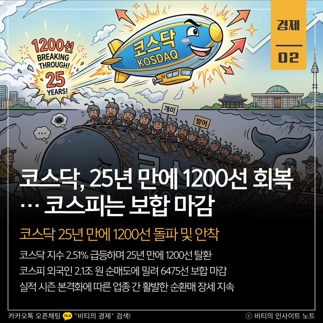 코스닥 지수가 25년 만에 1200선을 돌파하며 안착하는 역사적인 기록을 세웠습니다. 반면 코스피는 장중 6500선을 넘기도 했으나, 외국인의 2조 원대 대규모 매도세가 쏟아지며 보합권으로 마감했습니다. 실적 시즌을 맞아 업종 간 순환매 장세가 뚜렷해지고 있습니다.