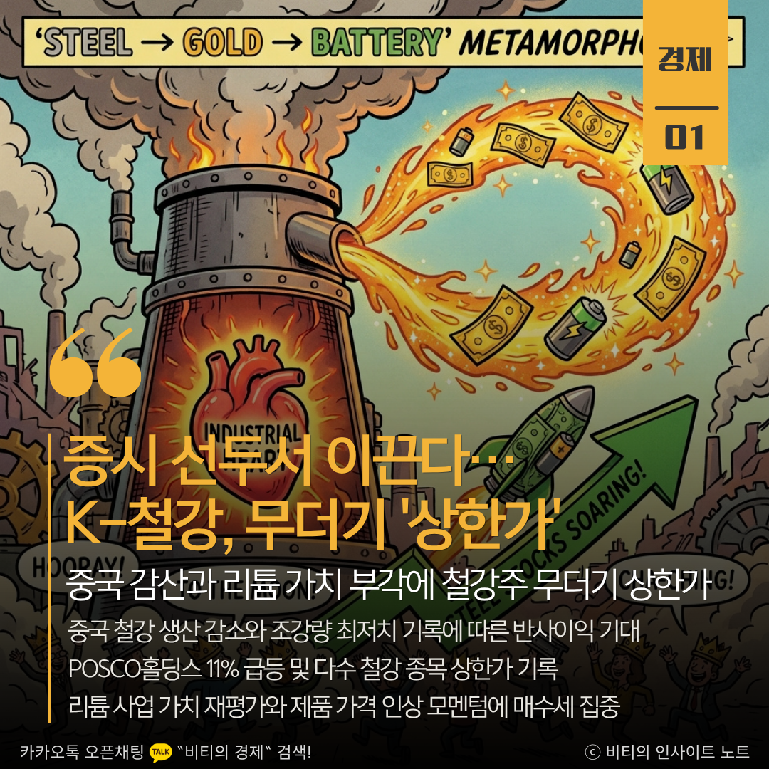 전통적인 굴뚝 산업인 철강이 중국발 감산이라는 호재를 만나 화려하게 부활했습니다. 단순히 수급 불균형에 기대는 것이 아니라 리튬과 같은 미래 에너지 소재 가치가 더해지며 업종의 체질 개선이 증명되고 있습니다. 고점 부담이 있는 코스피 시장에서 실적이 뒷받침되는 철강주가 든든한 버팀목 역할을 해줄 것으로 보입니다.