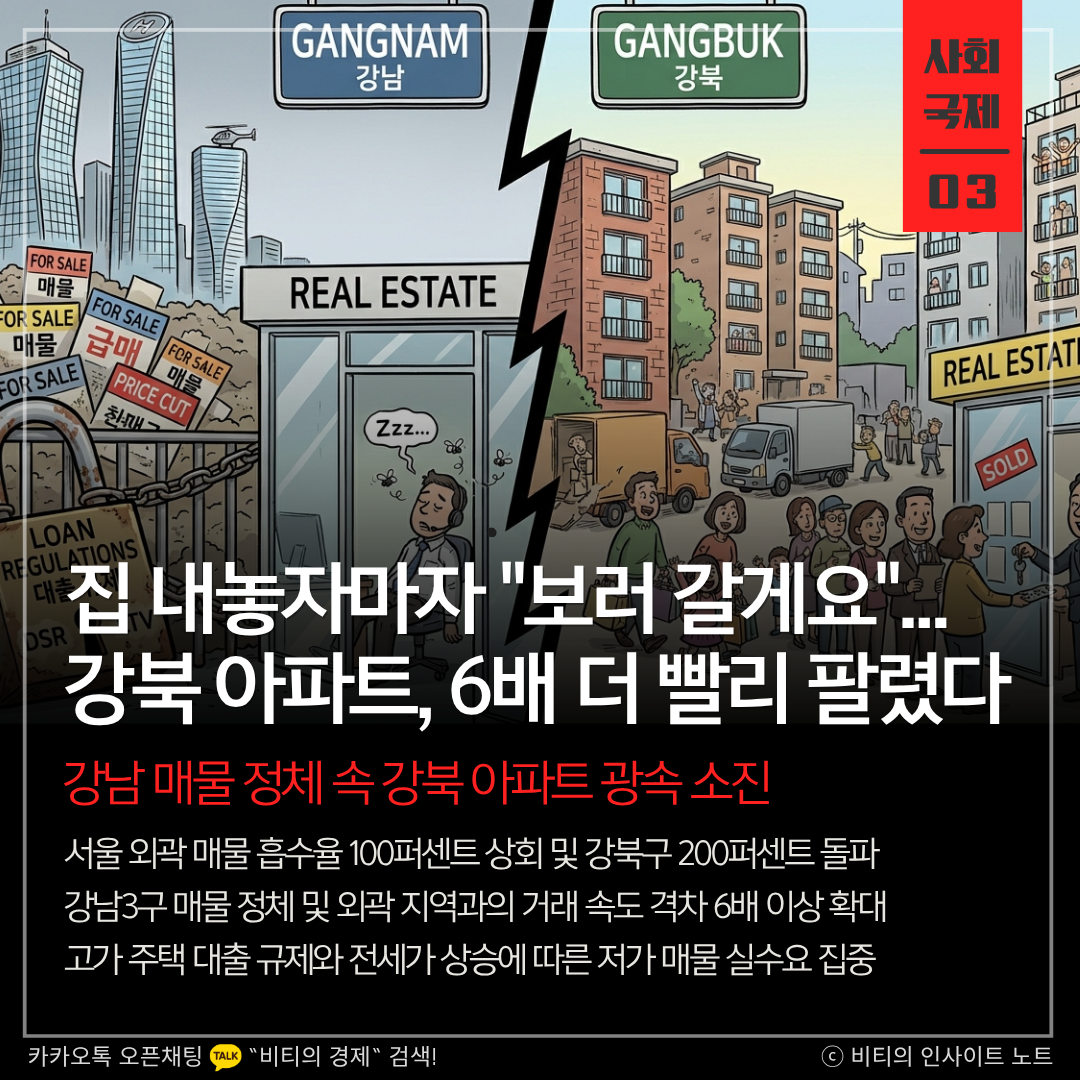 서울 강북 지역 아파트 매물이 강남보다 6배 이상 빠르게 소진되고 있습니다. 정부 규제로 강남권 거래가 정체된 사이 부담이 적은 외곽 지역으로 실수요가 집중되며, 신규 매물뿐만 아니라 기존 재고까지 무섭게 팔려나가는 추세입니다.