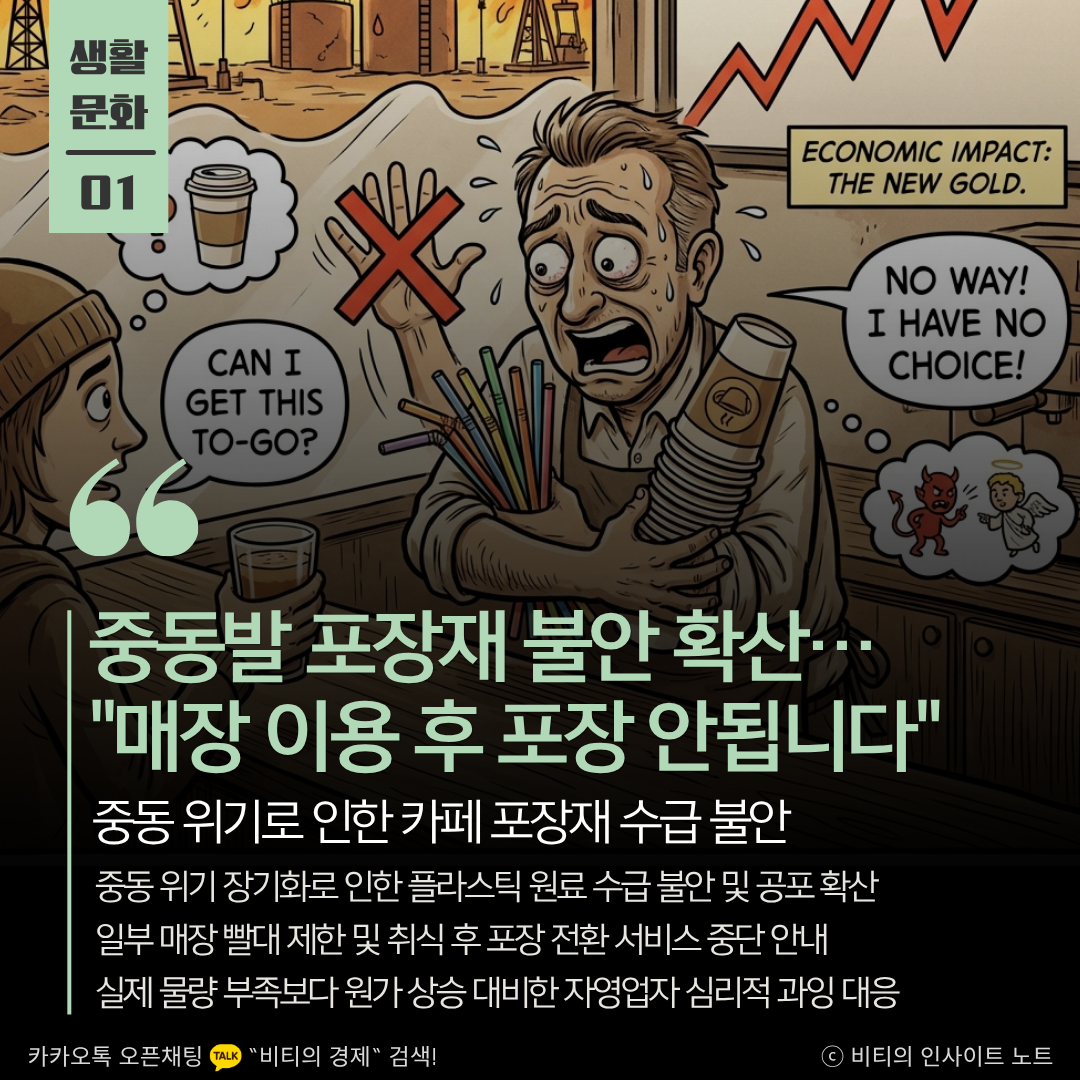 중동발 지정학적 리스크가 카페의 빨대 하나에까지 영향을 미치는 글로벌 공급망의 연쇄 반응이 매우 인상적입니다. 현재는 실제 부족 현상보다는 원가 상승을 우려한 심리적 공포가 시장을 먼저 움직이고 있는 상황입니다. 박리다매 구조의 저가 커피 매장일수록 부자재 비용이 생존과 직결되는 만큼 사재기라는 악순환으로 번지지 않도록 본사와 당국의 세밀한 수급 안정 메시지가 필요한 시점입니다.