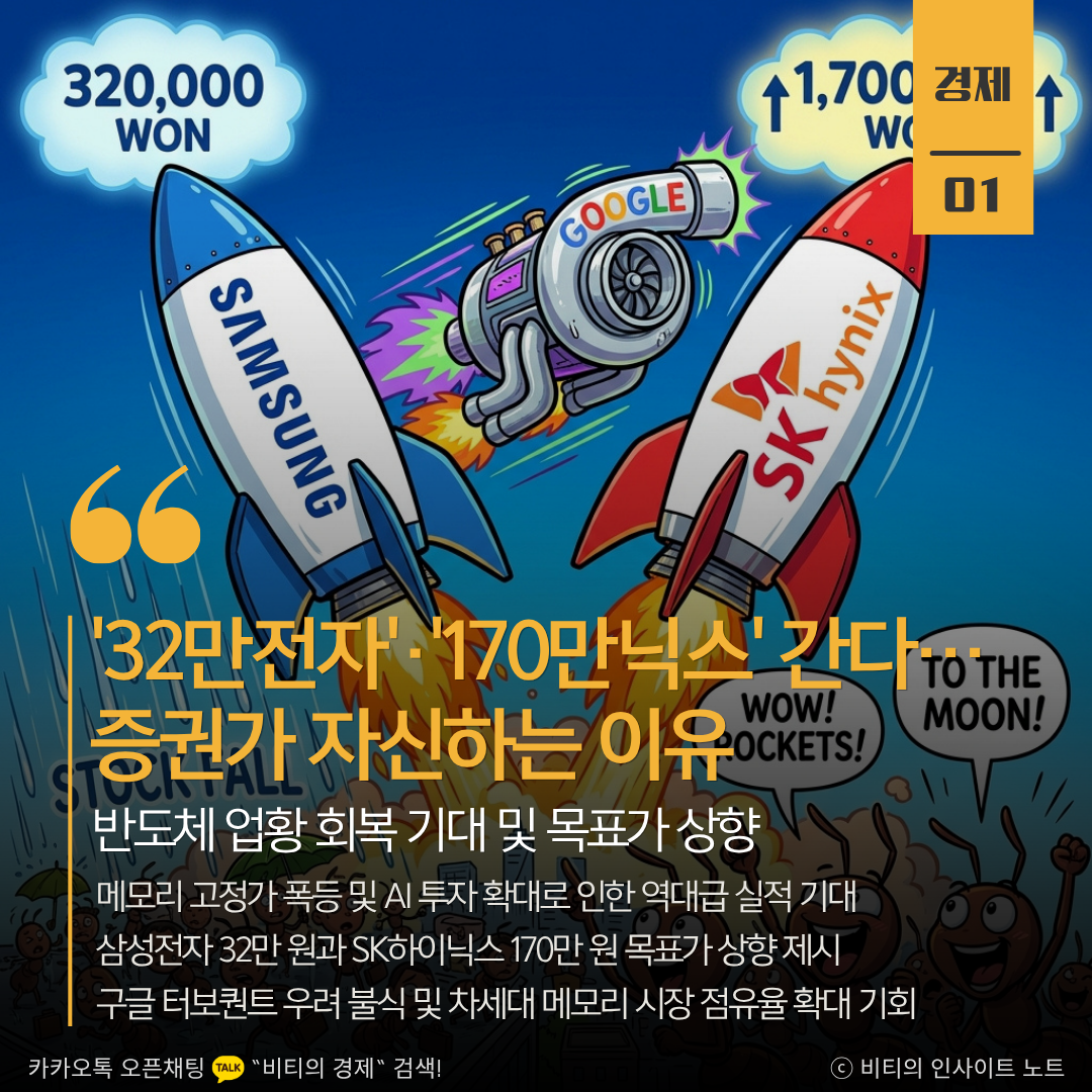 삼성전자와 SK하이닉스 주가가 최근 하락세를 보이고 있으나 증권가는 메모리 업황 회복과 AI 투자 확대를 근거로 역대급 실적을 전망하고 있습니다. 목표주가를 각각 32만 원과 170만 원까지 상향하며 반등에 대한 강한 자신감을 내비치고 있습니다.