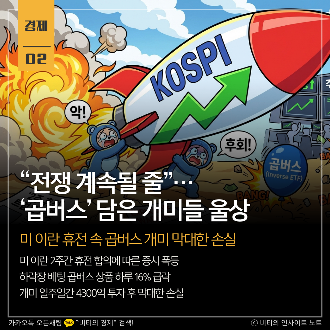 미국과 이란의 극적인 2주간 휴전 합의로 코스피가 급등하자 하락장에 베팅했던 개인 투자자들이 큰 손실을 입었습니다. 일주일간 4,300억 원 넘게 곱버스 상품을 사들였던 개미들은 예상치 못한 반등 소식에 하루 만에 16% 이상의 하락률을 기록하며 울상을 짓고 있습니다.