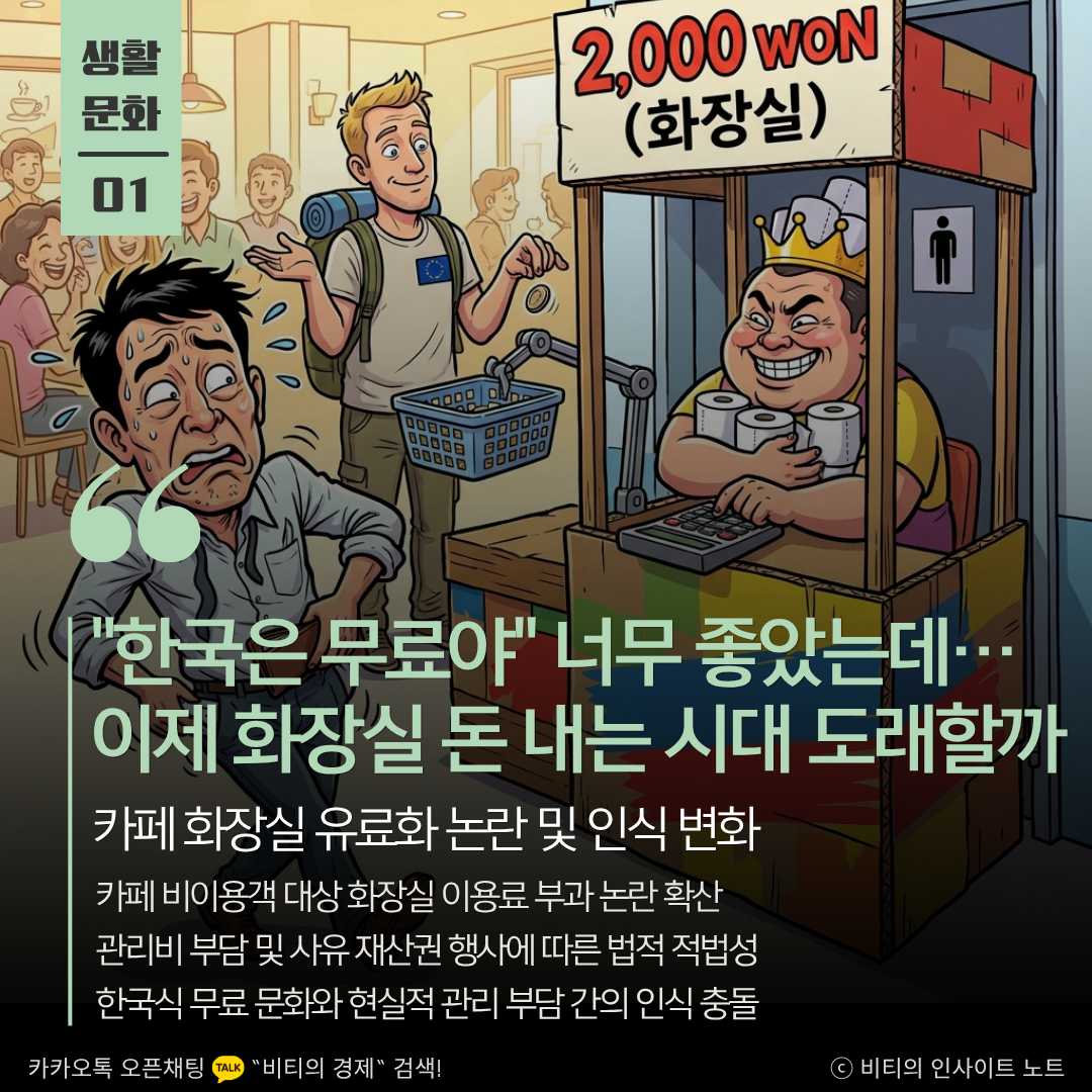 당연하게 누려온 편의가 비용으로 전환될 때의 거부감은 이해하지만 자영업자의 관리 부담 또한 무시할 수 없는 현실입니다. 화장실 유료화는 인심의 문제가 아닌 사유 재산 관리와 서비스 가치에 대한 인식 변화를 상징합니다. 공공 화장실 확충과 같은 정책적 뒷받침도 함께 고민해야 할 시점입니다.